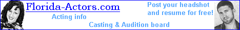 Florida Actors build their careers" Advertising Rates for the Florida Actors website.03/28/16/0241 - Advertisements for non-affiliated photographers or photography companies are suspended indefinitely on this web site. Advertising rights for Florida headshot photography, headshots, and photography services are now owned exclusively by Aurora PhotoArts, which is affiliated with us. That said, this site will continue to be a free online resource for professional and aspiring actors, both independent and agency represented, as well as non union and union. Use of this web site does not obligate the user to buy any services or products from our affiliates. 10/04/12 - As of 09/27/12, advertising on Florida Actors is suspended, pending review. This information is maintained on here for information, only. Don't just get random hits, advertise your affiliated products or services to our targeted traffic! If your product or service needs to reach talent in this market, you have come to the right resource. We get over 4 million hits per year with the majority being from the regional Florida area. If you need to reach the entertainment market in Florida, this is the place to do it. You have the choice of either free or paid advertising options on two websites, with several plans to suit your advertising budget. We prefer to have both a website and an e-mail contact with your ad copy for the free links. We only accept advertising from companies that are specifically related to modeling/fashion and acting or photography for the entertainment industry, and do not post sites that contain adult content or nudity. We reserve the right to refuse advertising we think is inappropriate for our sites, links to adult sites, sites containing nudity, pay or membership sites, or sites under construction. All advertising inquiries are subject to review prior to approval. When emailing us, please remember to indicate which site you are interested in, and which category. There is only a one month minimum for paid advertising. Free Link Categories: There is no charge to list your information on the following pages. Use the forms located at the bottom of the following five webpages to input your information to the Jobs or Model/Talent pages. Paid Link Categories: There is a $5 fee to list your information on the following pages. Announcements are removed after approximately 5-6 months. Other links are removed after one year. Please email your ad to FloridaActorsContact@yahoo.com with the title 'paid ad', and include in the body of the email which website and location you want (i.e. Florida-Models.com, Announcements). You will be invoiced via PayPal International. ·Industry Links Banner Ads: Depending on placement, banner ads run from $12 to $50 per month. Email with the title 'paid banner ad'. Include the website and location you'd be interested in. We will also need to see your banner. Send to FloridaActorsContact@yahoo.com